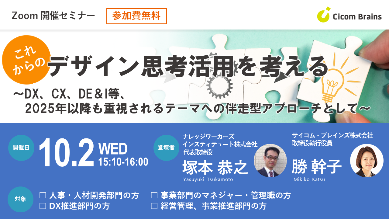 【これからのデザイン思考活用を考える―DX、CX、DE&I等、2025年以降も重視されるテーマへの伴走型アプローチとして】サイコム・ブレインズ取締役執行役員勝幹子によるセミナーを10月2日(水)に開催