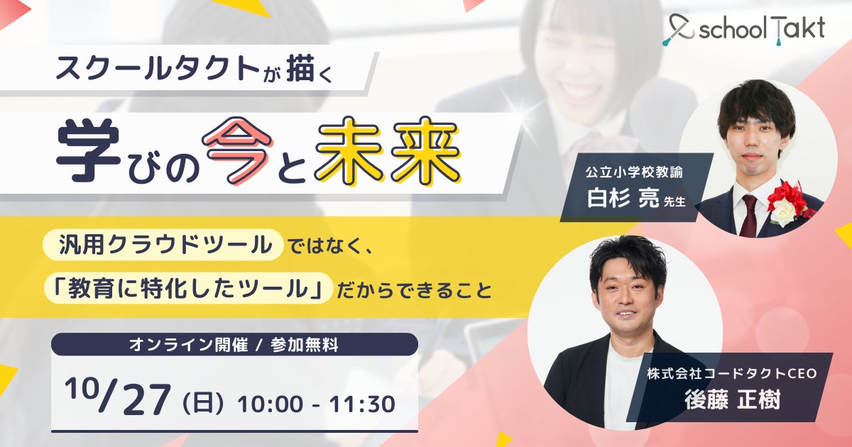 株式会社コードタクト(本社:東京都渋谷区、代表取締役:後藤正樹、以下「当社」)は、2024年10月27日(日)に教育関係者向けのオンラインイベントを開催します。