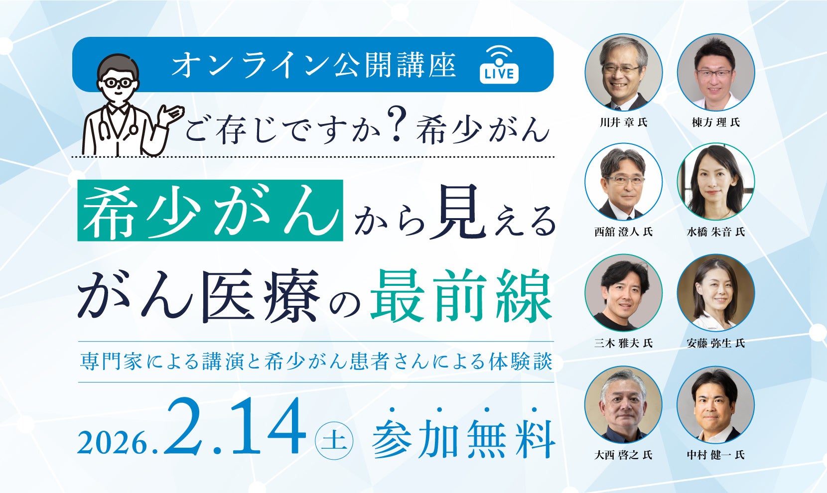 希少がん医療の最前線で治療開発や診療に携わる専門医と、実際に病と向き合う患者さんの声を通し、日本の医療現場で起きているいまの課題と希望を共有しながら、これからのがん医療について一緒に考えます。