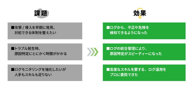 企業のセキュリティ担当者に代わり、ログ分析の専門スタッフが「ログを分析し、セキュリティの課題と対策をレポート」するセキュリティ対策サービスです。「サイバー攻撃の検知」「被害範囲の掌握」「内部不正の事前防止」など、ノウハウを要するログ運用業務を一括代行。専任のスタッフが「なにが起こっているのか」、「問題はなにか」を難解なログやレポートから読み解き、お客様と共に改善策を考えます。