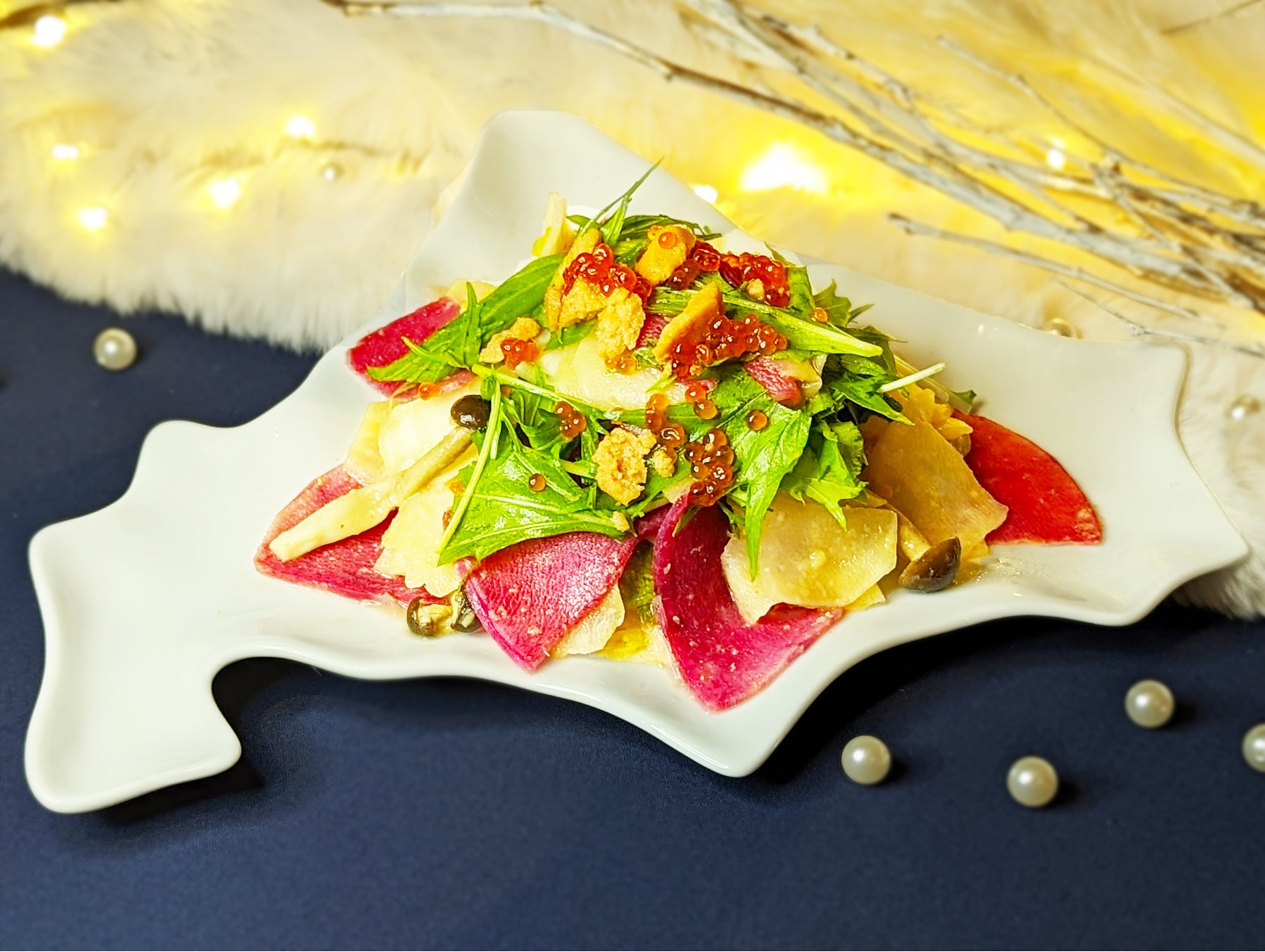 北海道の代表的な郷土料理の一つ、鮭と野菜を煮込み、味噌で味を整えた旨味たっぷりの石狩鍋をイメージした、「石狩鍋風 鮭といくらの紅白大根サラダ」。味噌バター風味のドレッシングのコク深い味わいに、鮭や大根、白菜、しめじの旨味が絡まり、優しい味わいに仕上げました。