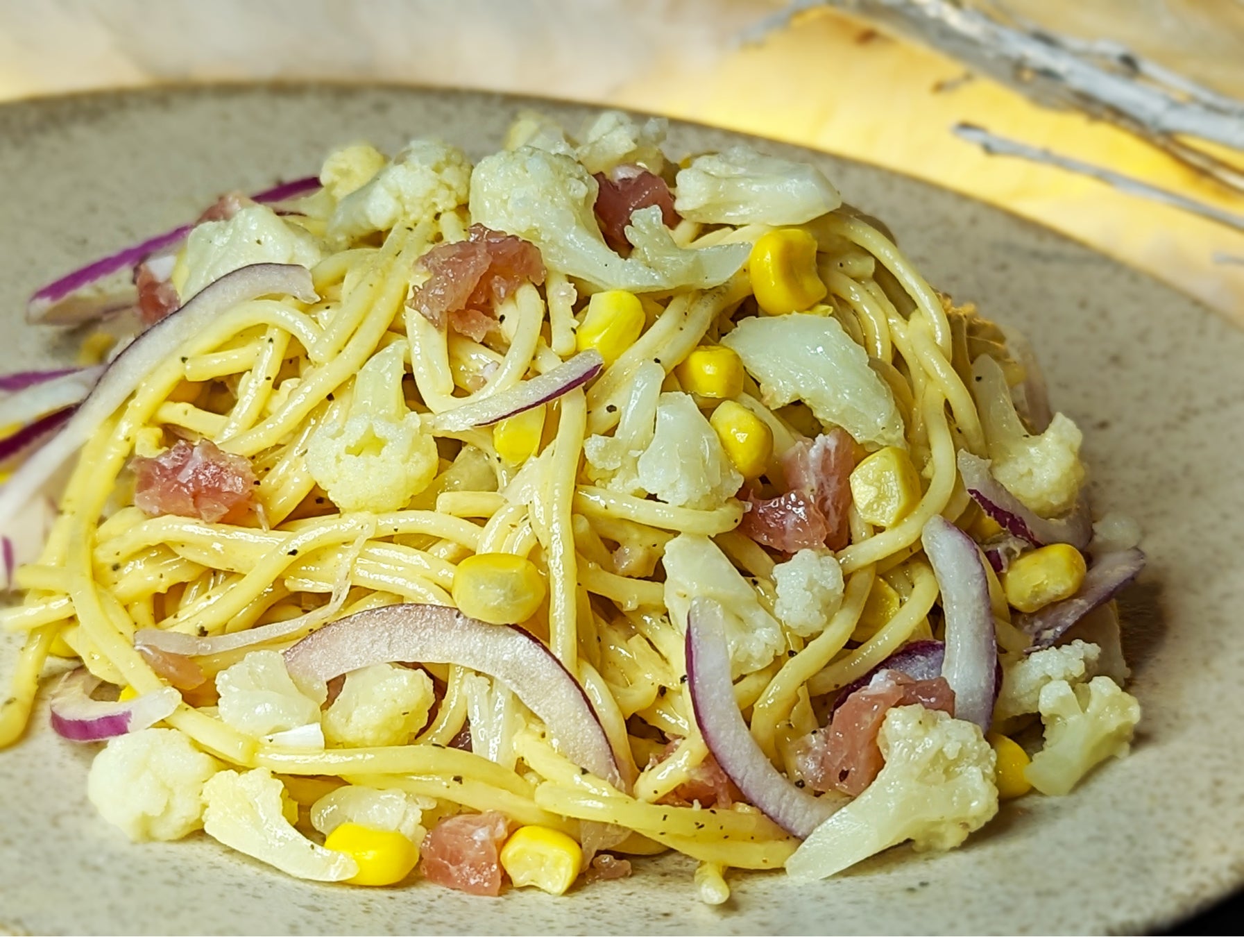 雪が降り積る雪原をイメージした、本格的な濃厚カルボナーラのパスタサラダです。美瑛コーン、赤玉ねぎ、生ハムやソースに含まれる牛乳と生クリームにまで北海道産を使用し、北の大地を丸ごと楽しめます。