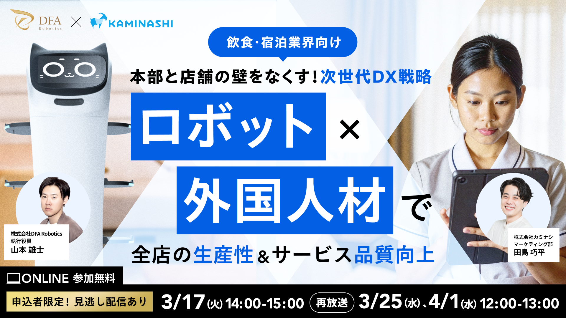 配膳・清掃・搬送ロボットであらゆる業界のDXを推進する株式会社DFA Robotics(本社:東京都港区、代表取締役社長:松林 大悟、以下「DFA Robotics」)は、現場DXプラットフォーム『カミナシ』シリーズを提供する株式会社カミナシ(本社:東京都千代田区、代表取締役CEO:諸岡 裕人、以下「カミナシ」)と共催で、2026年3月17日(火)に、飲食・宿泊業界の経営層や店舗運営責任者を対象としたオンラインセミナー「本部と店舗の壁をなくす! 次世代DX戦略 〜ロボット活用×多国籍人材活躍で全店の生産性とサービス品質向上〜」を開催いたします。(参加費無料・事前登録制)