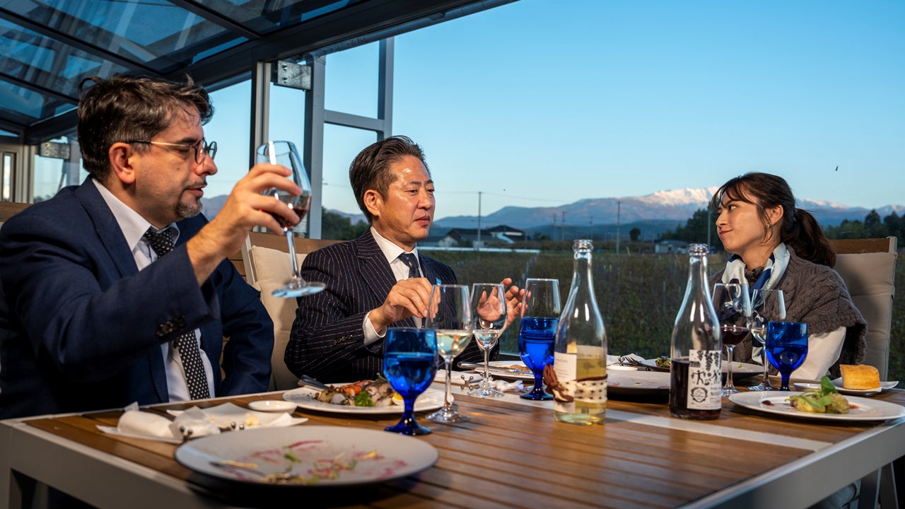 新政府軍との激しい戦いの後、西郷隆盛による寛大な措置を受けた庄内藩士により開墾された松ヶ岡へ一行は移動します。松ヶ岡開墾場では、鶴岡伝統のシルク製品から考えるサーキュラーエコノミーや、松ヶ岡でつくり発信する国産ワイン(写真上は エルサンワイナリー松ヶ岡)について、庄内から「ローカル」と「グローバル」を見据えた取り組みを紹介します。
