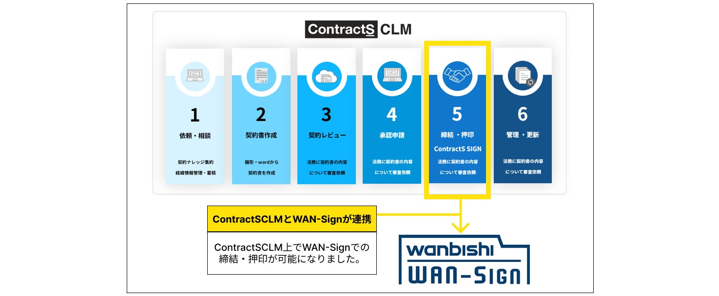 このたび、契約ライフサイクルマネジメントシステム「ContractS CLM」と電子署名を伴う電子契約に強みを持つ「WAN-Sign」が連携することで、契約検討・合意・手続き・管理・見直しに至るまで、お客様の契約業務における負担軽減や契約プロセスの効率化に貢献できるよう、今回のサービス連携を実施しました。