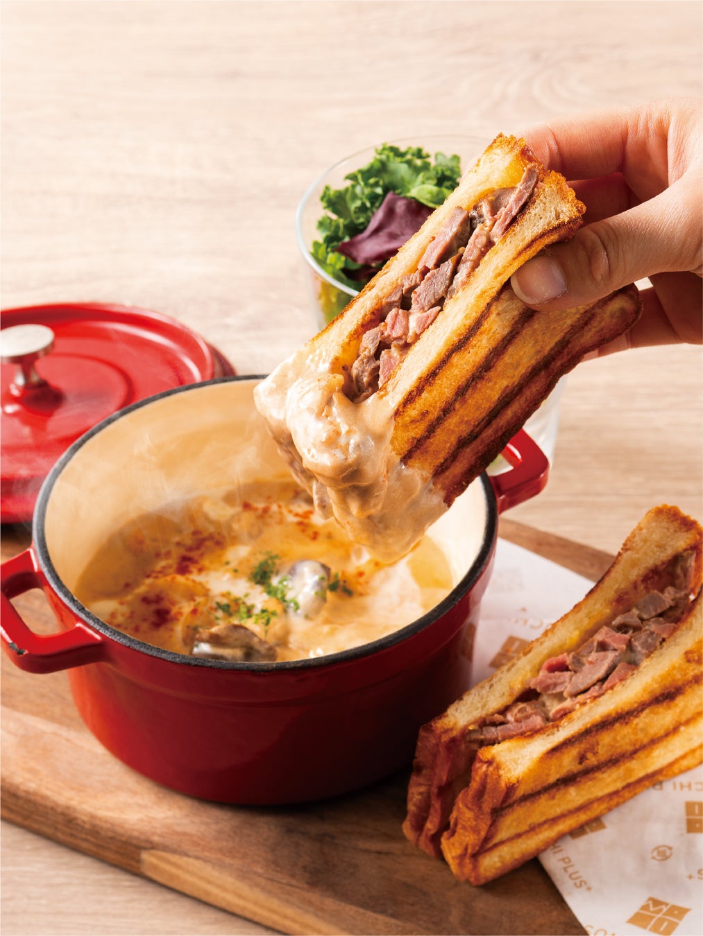 グリルサンドイッチとあたたかいシチューやカレーをそれぞれ味わい、またディップし一緒に味わう新スタイルの食事メニュー 「パンdeシチュー」。