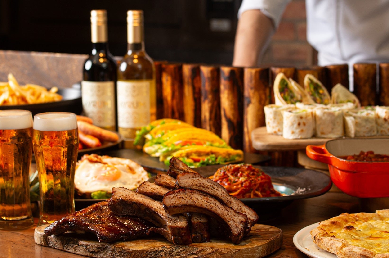 焼きたて!ビーフステーキ、ポークスペアリブ、マヒマヒのハワイアングリル、ハワイアンマカロニサラダ、ロミロミチキン、ハワイアンオレンジチキン、ガーリックシュリンプ、チョップ野菜とツナのポケ、スイートコーンのキッシュ、ビーフとオクラのガンボ、グリルソーセージ、カレー、本日のパスタ、ピザ、デザート など