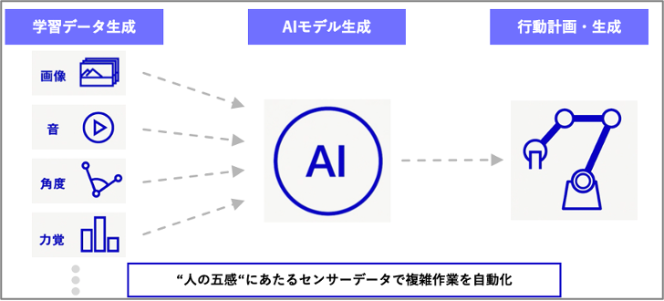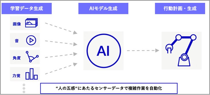 「exaBase ロボティクス」は、AIプラットフォーム「exaBase」のロボット向けAIとして、対象物の画像データ、現場機器・ロボット制御データやシミュレータ生成データ等、様々なマルチモーダルデータを活用して工程の自動化・最適化を可能にするロボットAIソリューションです。単純作業の代替や熟練者の動作再現等、様々なシーンで活用することができます。