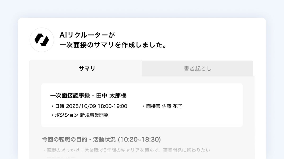また、面接の書き起こしをもとに内容を振り返ることで、面接官のスキルアップや面接全体の質の標準化にも取り組めるようになりました。採用プロセスの効率化と品質向上を両立できるツールだと感じています。