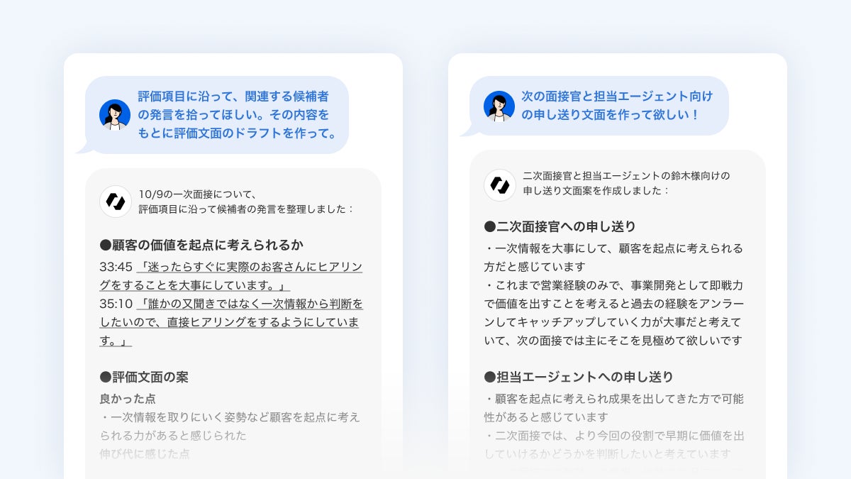 書類選考での基準に沿った一次スクリーニングの補助、面接内容の自動書き起こし・サマリ作成、評価の下書きの作成、次の面接官やエージェントへの申し送り文面案の作成などをAIが自動で行います。また、採用要件や評価基準の見直しなどの採用プロセス自体の改善提案や、有力候補者への訴求・コミュニケーション方針の提案も可能です。