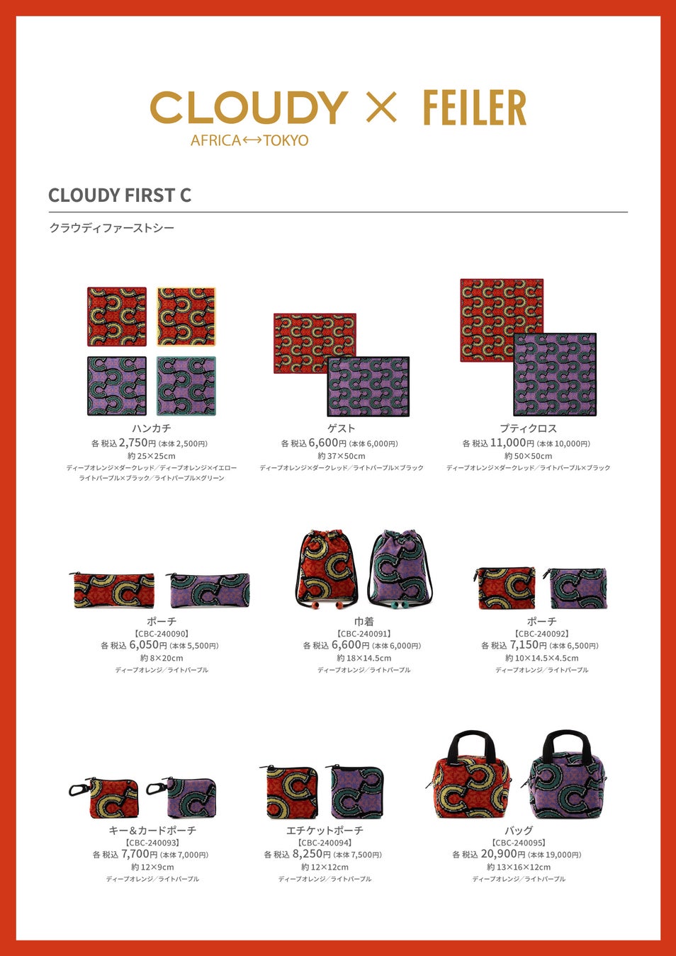 今年で4回目となる2社でのコラボレーション。CLOUDYのガーナ人デザイナーが描いたオリジナルテキスタイルが、ドイツの伝統工芸織物シュニール織で表現されています。フェイラーの定番アイテムであるハンカチやタオルをはじめ、バッグ、ポーチなど、シュニール織を使った豊富なアイテムが揃います。今回発売するのは、Cの文字が、まるで踊るように舞っているデザインパターン『CLOUDY FIRST C(ファーストシー)』。CLOUDYの頭文字Cであり、チェーンのようにCが連なる姿は、 CLOUDYをきっかけに、人と人、国と国がつながってほしいという思いを込めています。アフリカンファブリックからインスピレーションを得たカラーとデザインをお楽しみください。カラーは、ディープオレンジとライトパープルの2色展開です。