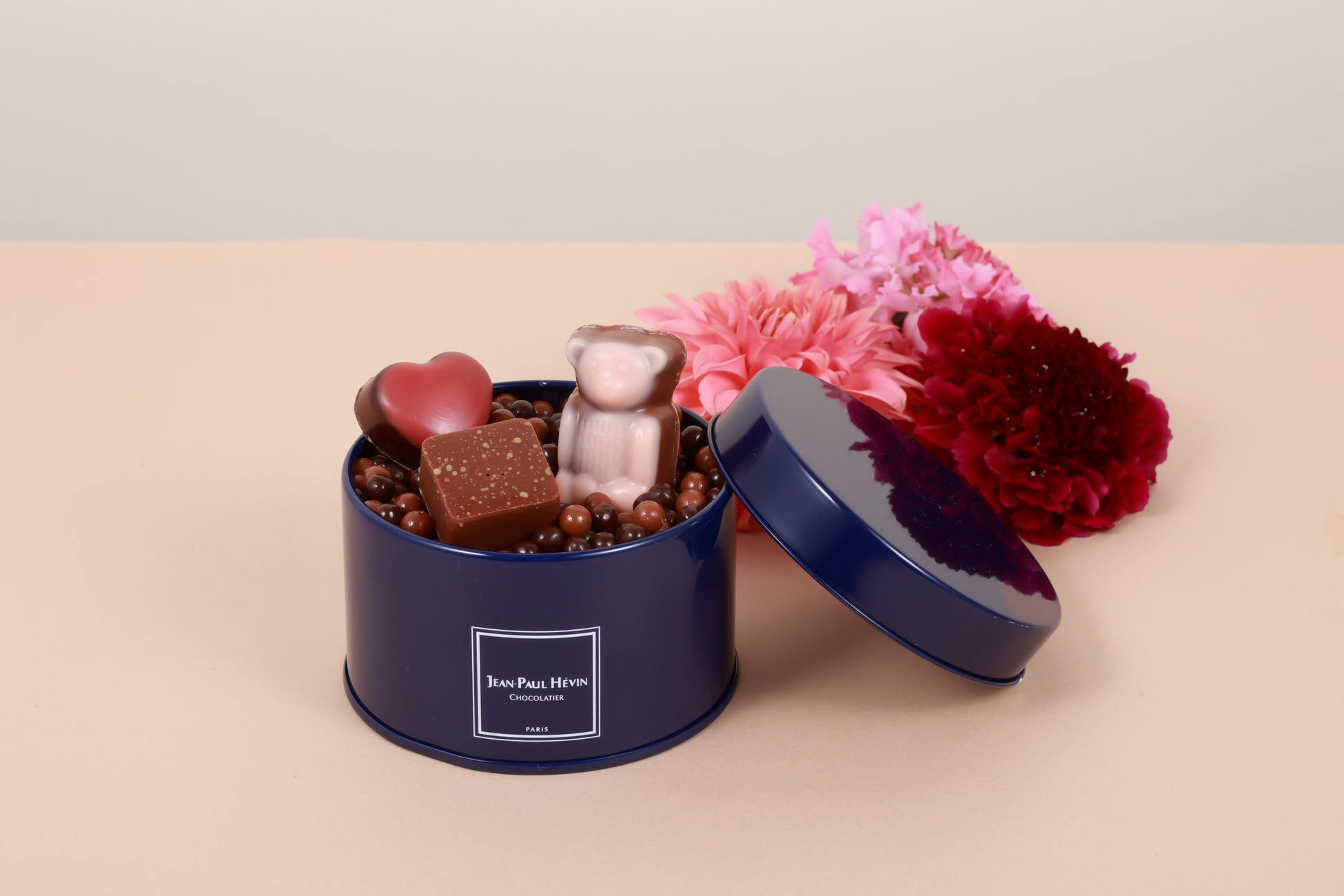 クマの形とハート形のショコラ、期間限定ショコラ「ジョーヌ プランタニエ」をペルル クラッカントゥと一緒にブルー缶に詰合せ。