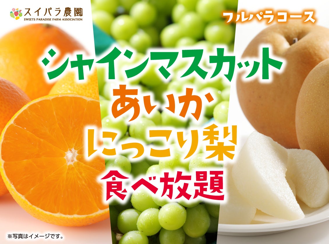 2024年12月11日(水)よりスイーツパラダイスでシャインマスカット食べ放題第4弾「シャインマスカット・あいか・にっこり梨食べ放題」を開催いたします。
