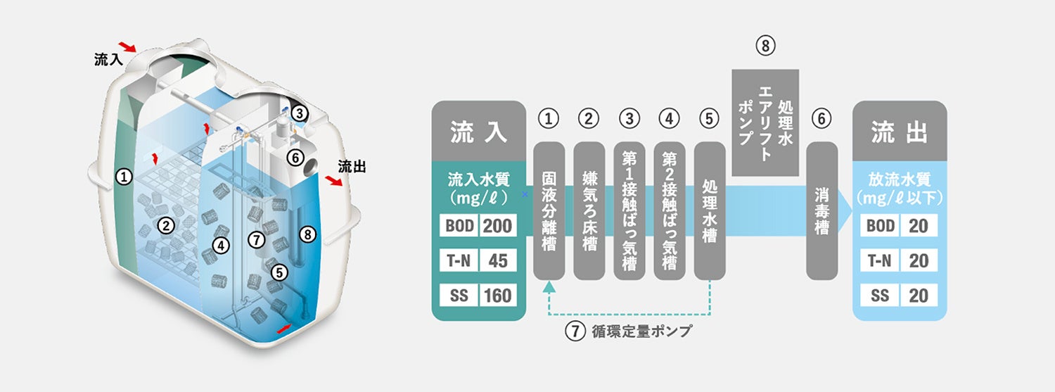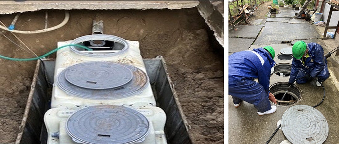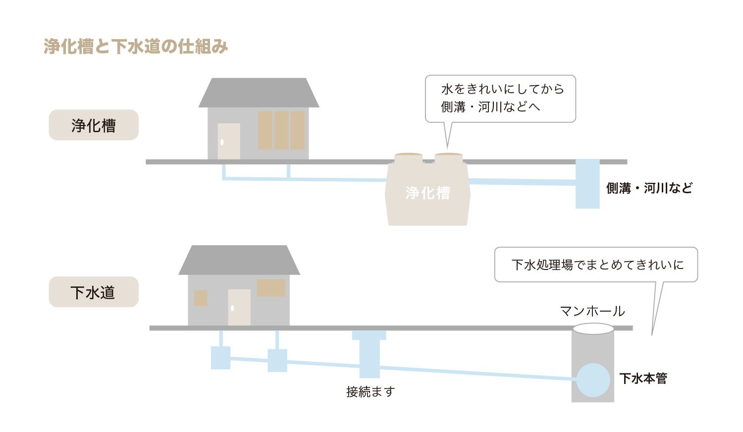 地中に埋まっているため、普段の生活で目にする機会のない浄化槽。浄化槽とは、公共の下水道が配管されていない家庭に設置されている、汚水処理設備です。浄化槽の中に生息している微生物を利用して、各家庭のトイレやキッチン、お風呂場などから流れてくる生活排水をキレイにし、河川や海などに放流することで、水環境の改善に貢献しています。