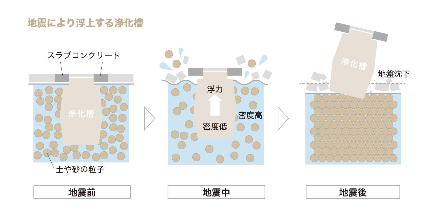 地盤は土や砂の粒子が地下水に支えられてできています。地震の振動で地下水の圧力が高まると、粒子の結合が失われて液状化が起こり、地盤が泥水のようになります。この状態では地盤の密度が浄化槽より高くなるため、強大な浮力が発生し、地上のコンクリートごと浄化槽が地上に押し上げられてしまうのです。