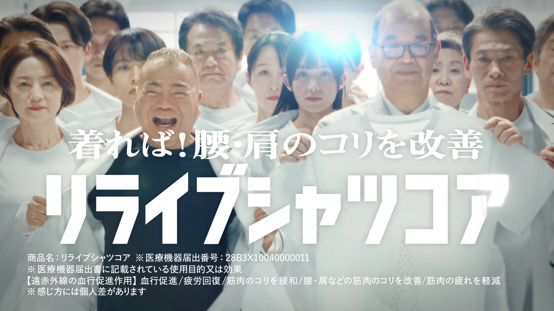 白衣姿の開発者と研究員がリズムに合わせて登場し、「着れば、腰・肩のコリを改善」「セラミック生地で血行をけっこう促進」という製品特長をテンポよく訴求。繰り返しの演出により、一般医療機器としての機能性と特徴を印象付ける内容となっています。
