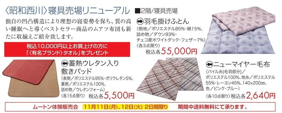 さいか屋横須賀店に11月2日(土)「昭和西川ショップ」がグランドオープン!11月11日(月)・12日(火)にはムートン特別販売会も実施いたします。<オープン特別キャンペーン実施中>