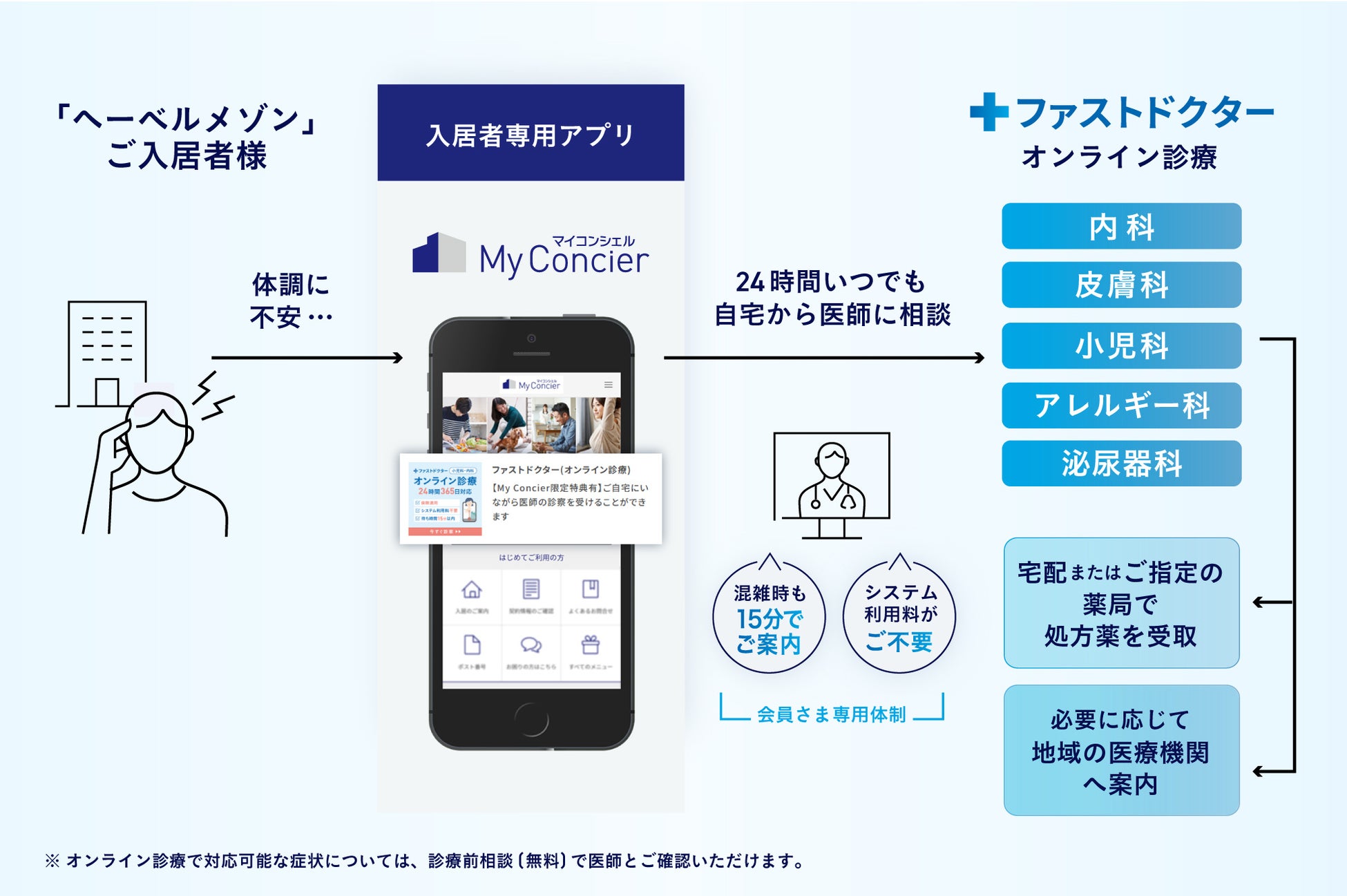 入居者専用アプリ「マイコンシェル」を介してファストドクター提携医療機関によるオンライン診療を24時間365日利用可能