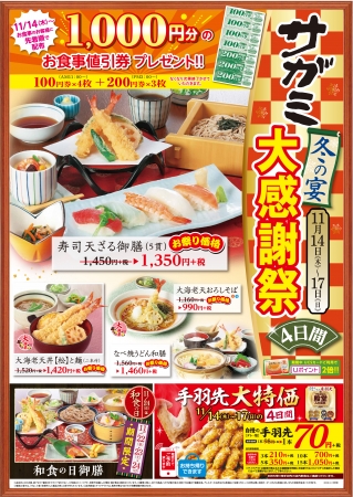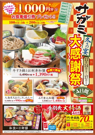 この度、和食麺処サガミを展開するサガミレストランツ株式会社(本社:名古屋市守山区八剣2丁目118番地 代表取締役社長 伊藤 修二)は、和食麺処サガミ全店で2019年11月14日より 『サガミ大感謝祭』冬の宴を開催いたします。