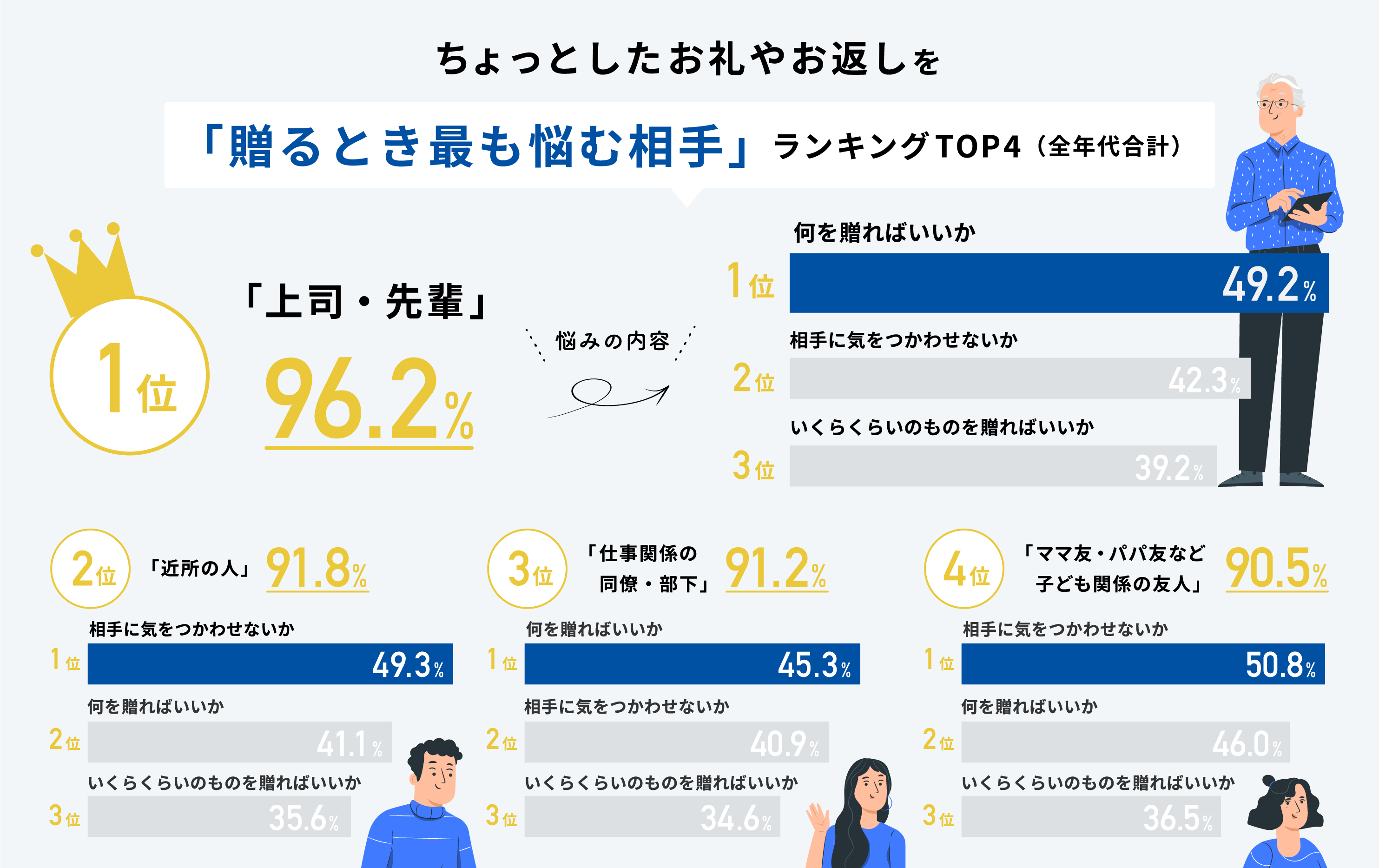 - ちょっとしたお礼やお返しを贈るとき最も悩む相手は『上司・先輩』(96.2%)が圧倒的