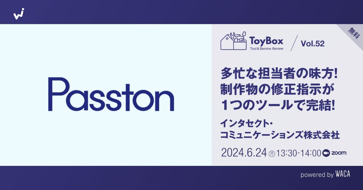 今回、インタセクトでは、「【ToyBox】Vol.52 【無料】多忙な担当者の味方!制作物の修正指示が1つのツールで完結!」と題し、6月24日(月)13:30より、当社広告事業本部 WEBマーケティング 2部 リーダーの岩井 久美子が登壇、当社が開発した修正指示ツール「Passton(パストン)」(https://www.passton.jp)の使い方や活用方法をご紹介します。