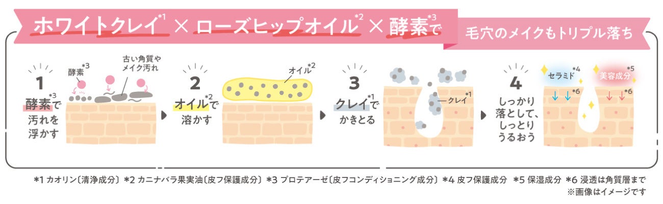 汚れを酵素*8で浮かせ、オイル*7で溶かし、クレイ*3でかきとるトリプルアプローチで、うるおいを守りながら、毛穴に入ったメイクや汚れ、古い角質までしっかりと落とします。
