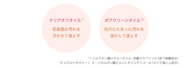 肌表面の汚れを浮かせて落とす「クリアオフオイル*5」と、毛穴にたまった汚れを溶かして落とす「ポアクリーンオイル*6」のダブルオイル処方で毛穴にアプローチ。気になる毛穴汚れや古い角質、角栓をすっきりと落とします。