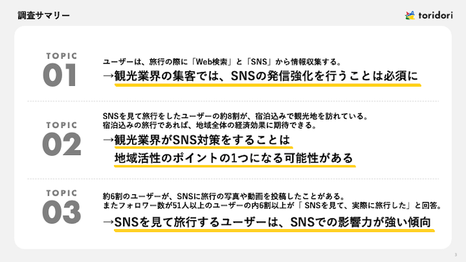 ユーザーがSNSから旅行に関する情報を収集している新習慣を考慮し、観光業界はSNSを上手に活用し、口コミ投稿を増やすなど効果的なSNSを活用したプロモーション施策を行う必要性があると言えるでしょう。