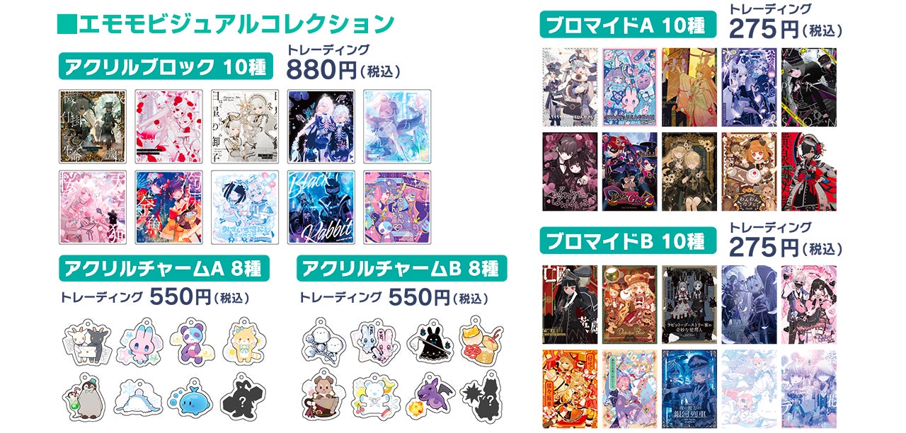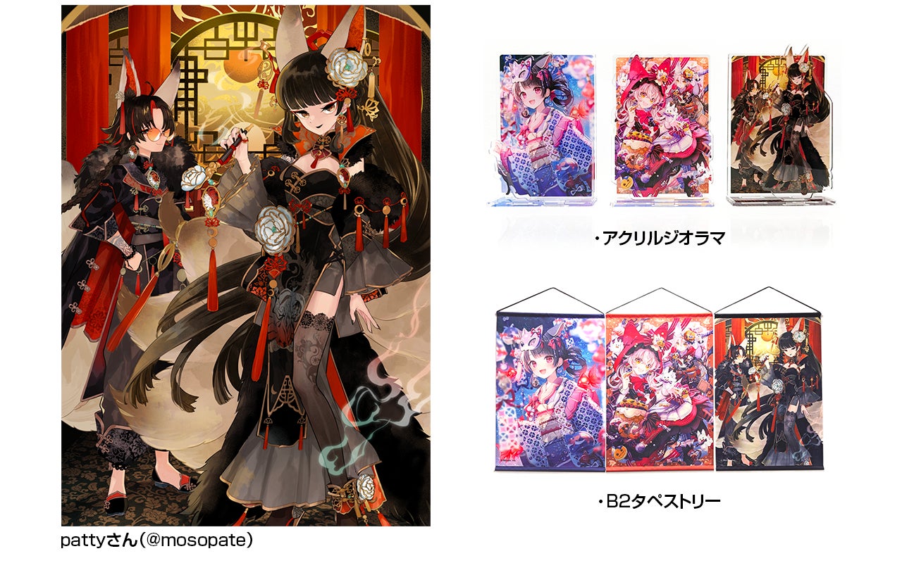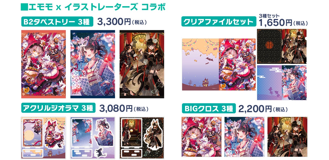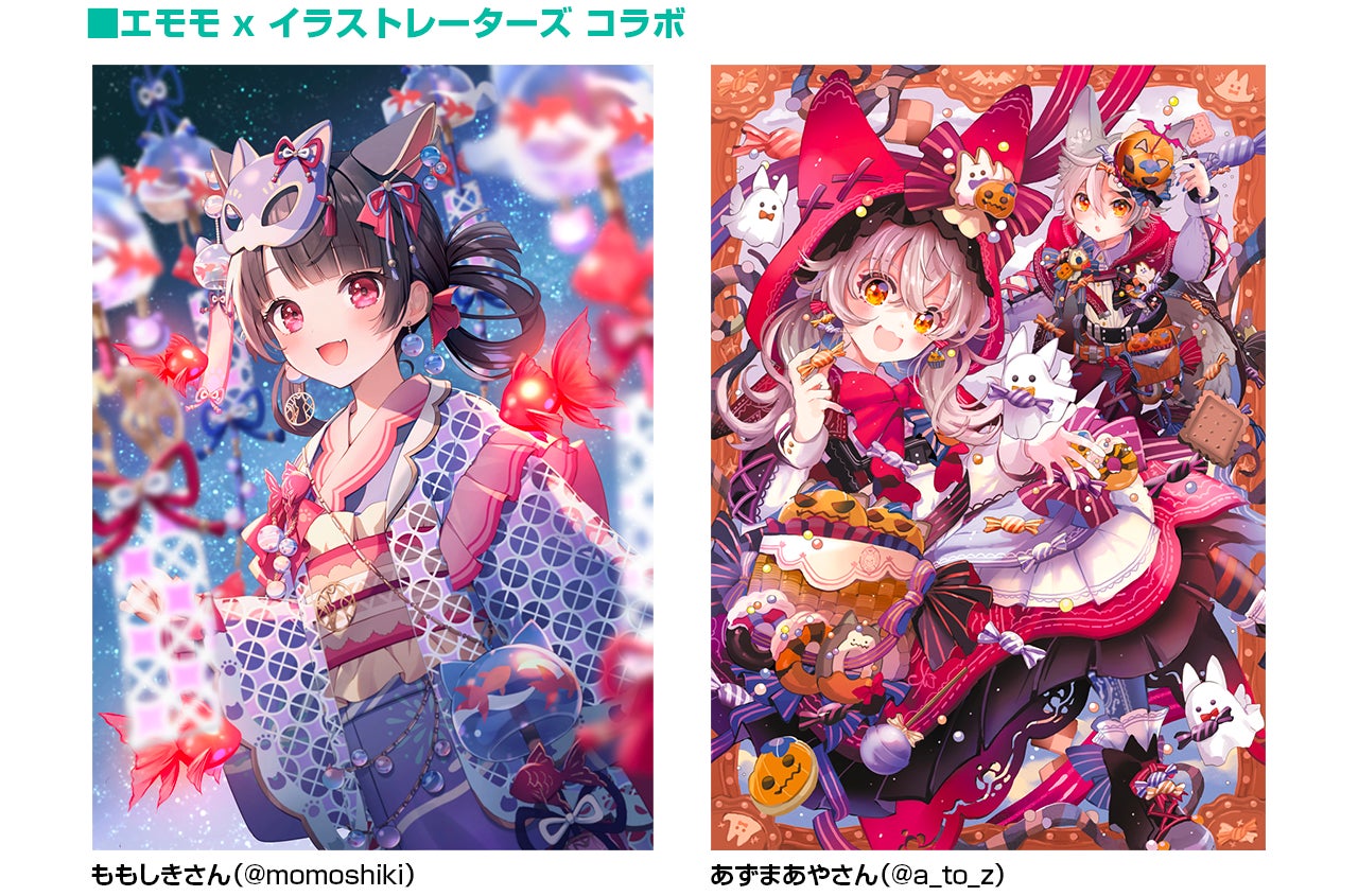人気イラストレーターのあずまあやさん (@a_to_z)、ももしきさん (@momoshiki)、pattyさん (@mosopate)が、エモモイベントをテーマにした描き下ろししたイラストのコラボ商品、ライブゲーム商品等、オリジナル商品を多数ご用意しています。