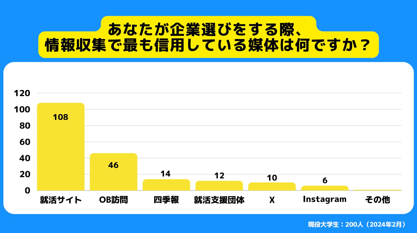 企業選びをする際に、情報収集で最も信用されている媒体については、54%の学生が就活サイトであると回答しました。紙媒体のメディアではなく、就活サイトや、実際に会うOB訪問への信用度が高いようです。