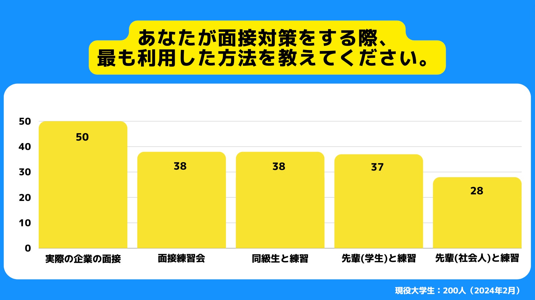 面接対策の方法は、実際の企業の面接を受けるという回答が25%と1番多かったですが、そのほかの選択肢もばらつきがなく、ひとつの方法に確立されているということはありませんでした。