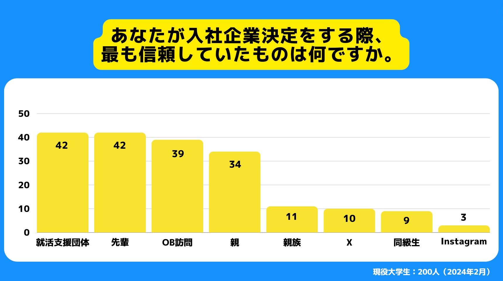 ■就活で最も信頼しているのは大学の先輩(学生)であると回答。