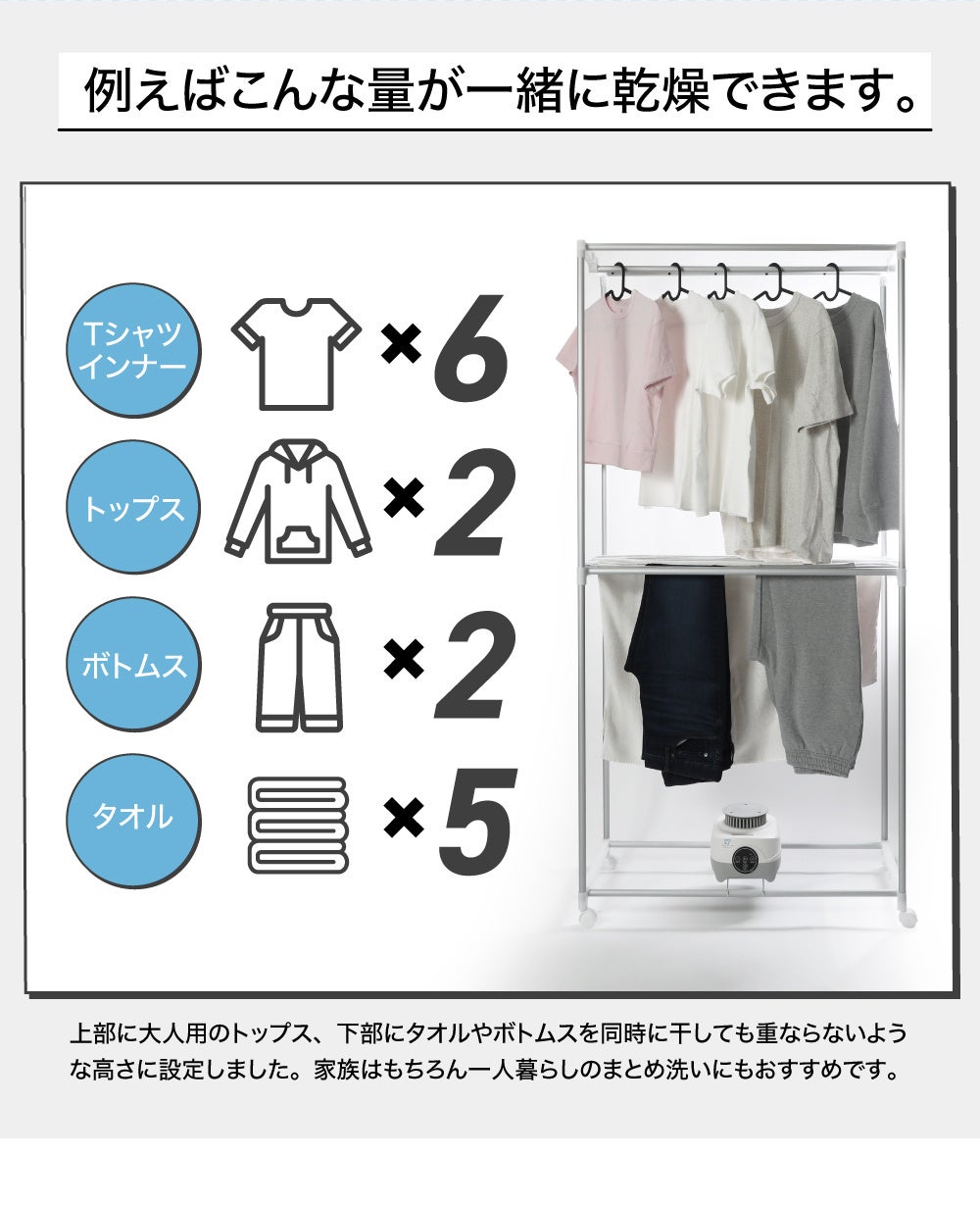 ユーザー様の「もっとたっぷり干したい!」という声にお応えし、2023年12月にサイズを一回り大きくリニューアル。これにより乾燥容量が大幅にアップし、ご家族分の洗濯物など、より多くの衣類を一度に効率よく乾燥させることが可能になりました。
