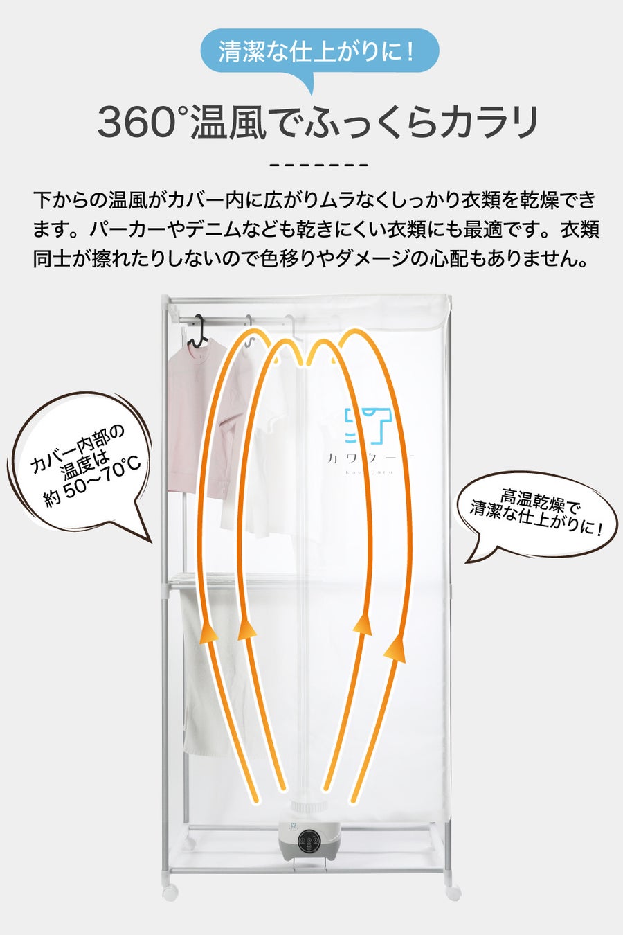 寒くて乾きにくい冬や梅雨の生乾き臭対策、花粉やホコリの付着をサポートする現役ママ考案の室内用乾燥機です。ラック下部にあるヒーターからBOX状のカバー内に設置した洗濯物へ高温熱風をあて、ふっくら、カラリと乾燥させます。