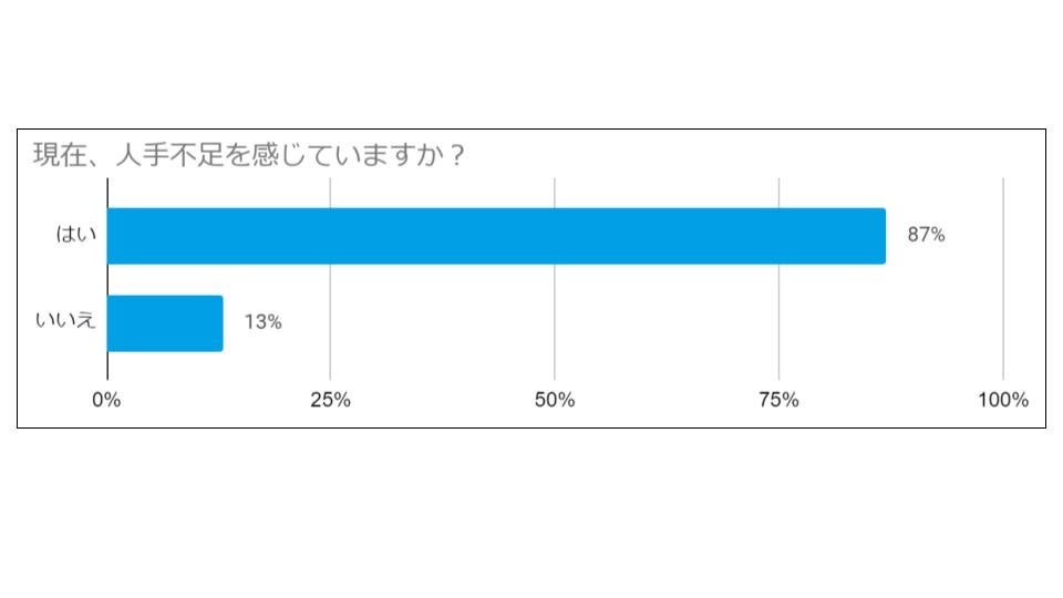 「人手不足を感じているか」との質問に対して「はい」と回答した施設は、87%に達しました。多くの施設で人手不足を感じていることがわかります。