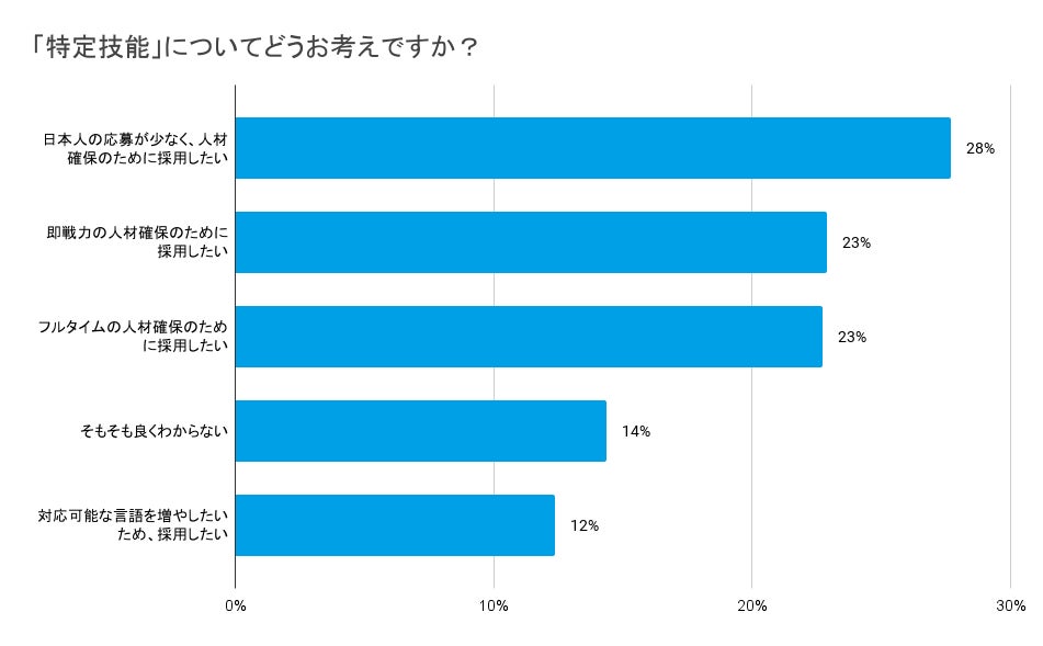 「特定技能についてどのように考えているか」との質問に対して「日本人の応募が少なく、人材確保のために採用したい(28%)」が最も多い回答となり、不足している労働力を補う目的としての活用を考えている宿泊施設が多いと言えそうです。また、「そもそも良くわからない」と回答した宿泊施設は14%にとどまっていることから、外国人労働者の受け入れ方法について業界理解は進んでいると考えられます。
