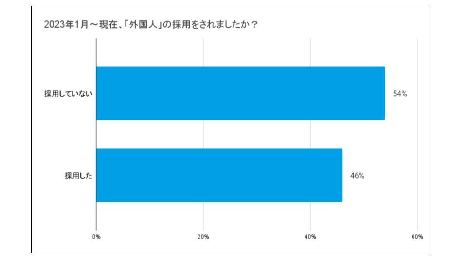 「2023年1月以降に外国人の採用をしたか」との質問に対して「採用した」と回答した宿泊施設は、46%にとどまりました。人手不足を感じているものの「外国人」の採用を行っていない施設は54%もあることがわかります。