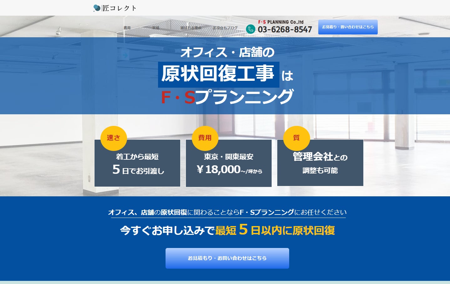 【店舗やオフィスの原状回復】商業施設の原状回復費用にお困りの方へ。専門家検索プラットフォーム「匠コレクト」に原状回復業者、株式会社FSプランニングのサービスをリリース
