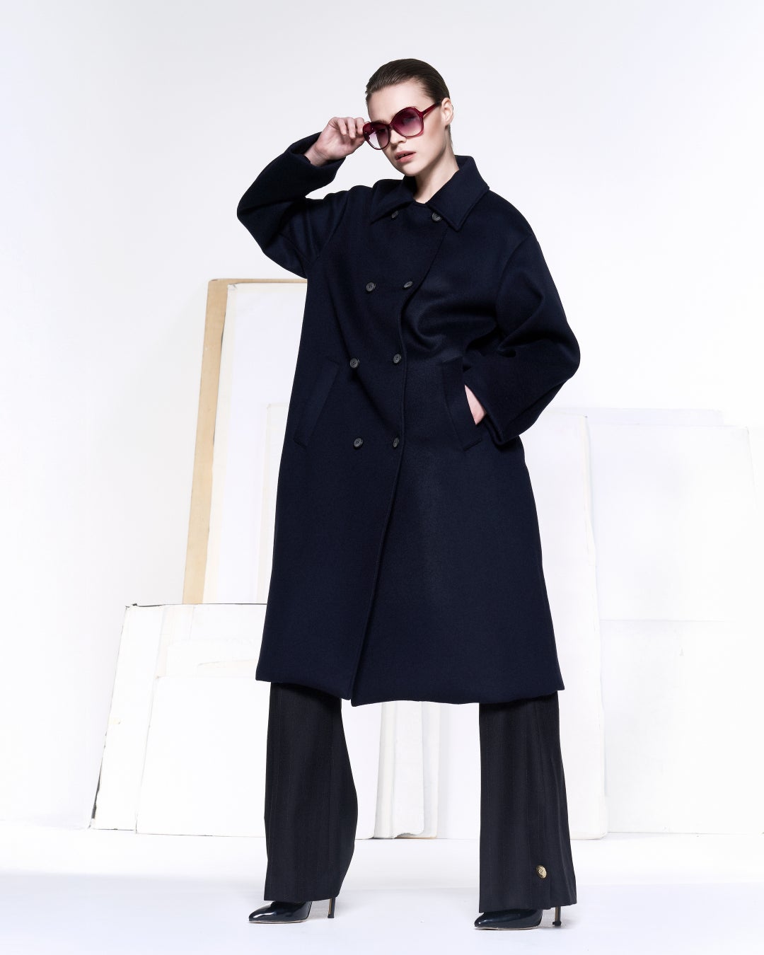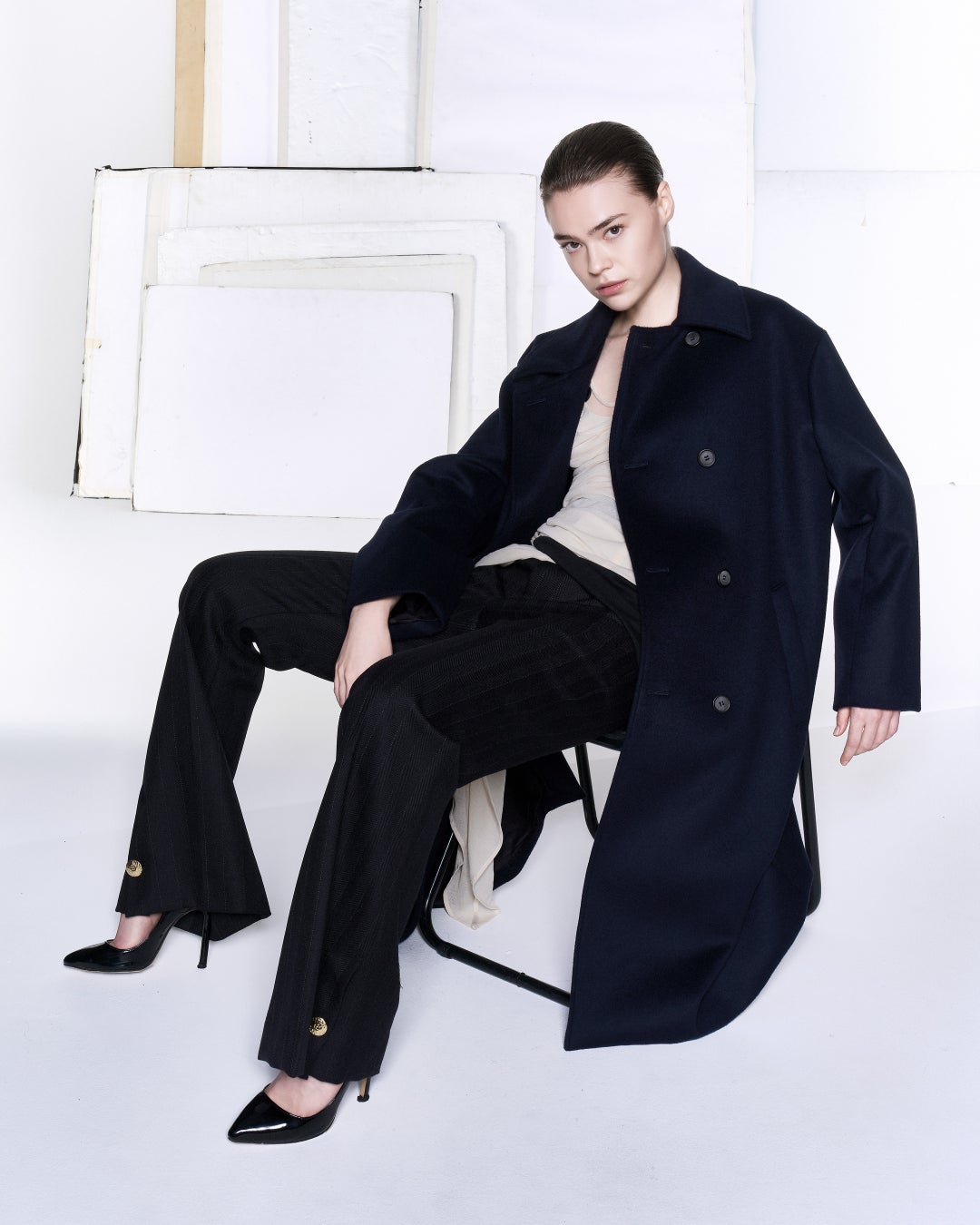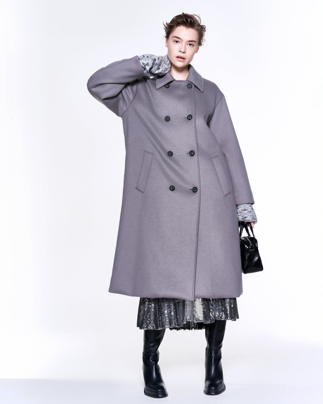 ロングコートはクラシックなダブルブレストをベースに、大きすぎない襟元が上品な印象を保ちながら、顔まわりをすっきりと見せます。羽織るだけで背筋が伸びるような端正な佇まいと、程よく肩の力が抜けたシルエットのバランスが魅力です。