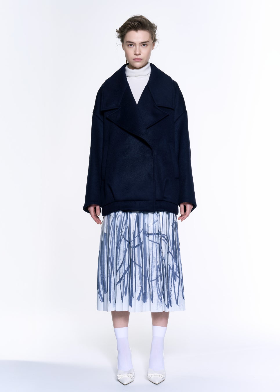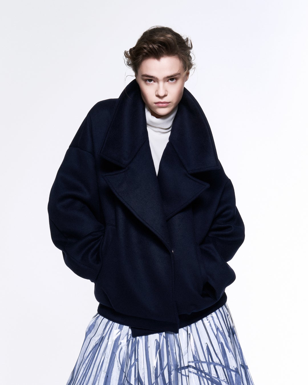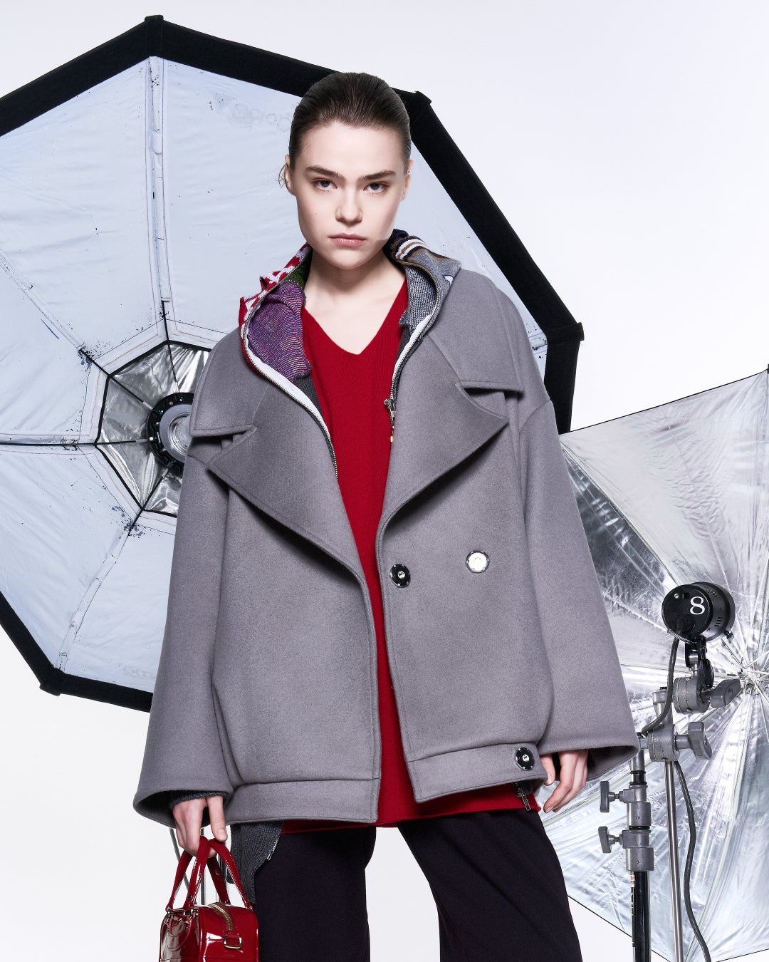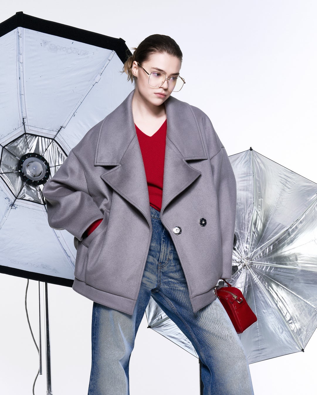 一方、ショートブルゾンは印象的なビッグカラーとコクーンシルエットが特徴。裾に入れたタックが柔らかな丸みを生み、構築的でありながら女性らしいフォルムを演出します。パンツにもスカートにも合わせやすく、冬の装いを軽やかにアップデートしてくれます。