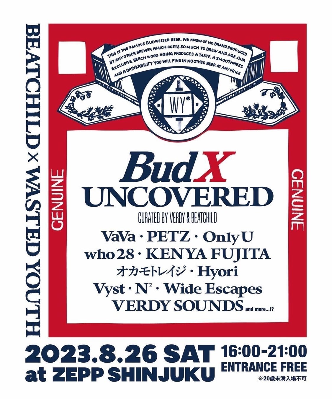今注目の才能あふれるアーティストをバドワイザーが「BUDXUNCOVERED」というグローバルプラットフォームを用意し、応援するこのイベントは2023年8月26日(土)に昼の部「BUDXUNCOVERED CURATED BY VERDY & BEATCHILD」と夜の部「BUDXUNCOVERED Wasted Night」の2部構成にて開催致します。