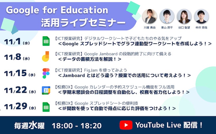 11月は、今注目を集めている Google Jamboard™ の情報から、毎回講評いただいている「Google スプレッドシート™ の便利技」シリーズまで、盛り沢山の全5回開催です!