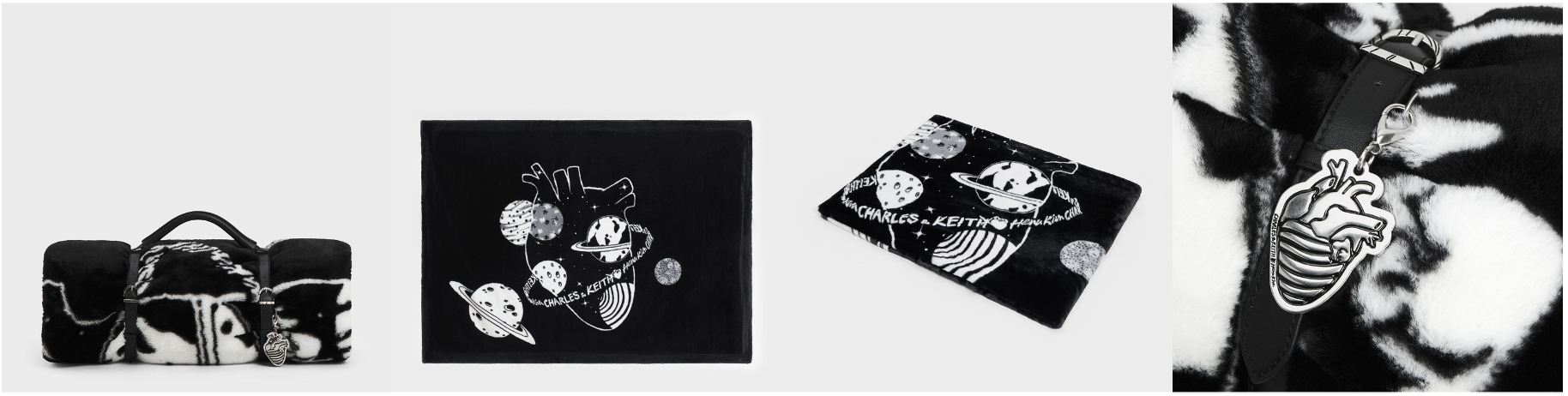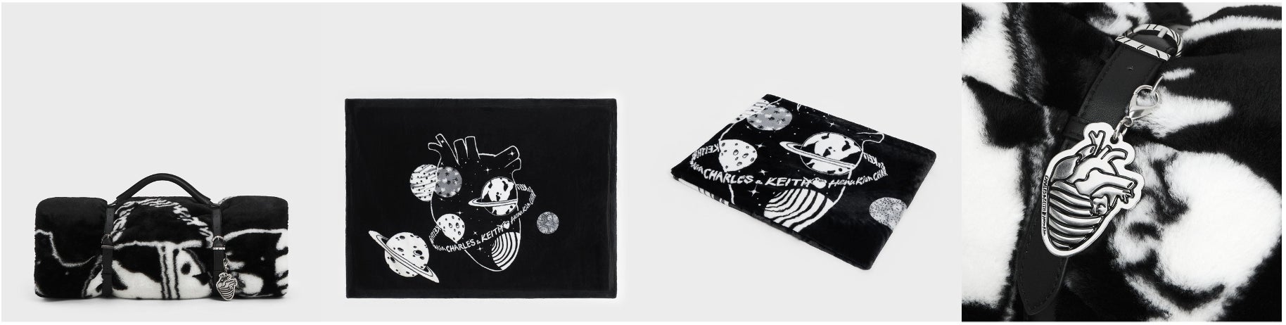 「イラスト ハートチャームアンクルブーツ」と「イラスト ハートチャームルーシュドホーボーバッグ」は、解剖学的な心臓のイラストを反映したメタリックの装飾が特徴です。同じデザインのフェイクレザーのシュシュと、ブランケットも展開します。宇宙をテーマにしたブランケットには、キムのもう一つのトレードマークである惑星の銀河が心臓を取り囲むように描かれ、”感情”と同じように広大な“宇宙の広さ”を象徴しています。また本コレクションの商品全てに、ヘン・キム描き下ろしのオリジナルイラストステッカーが同封されています。