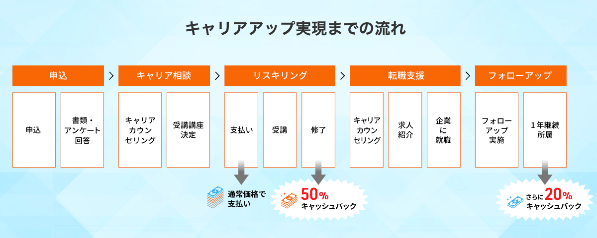 転職希望者のキャリア相談、リスキリング、転職を一貫して支援。キャリアアップを実現すると受講料最大70%キャッシュバック