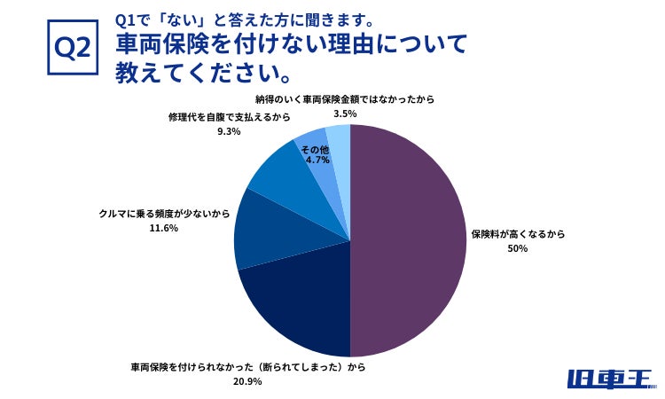 次にQ1の質問で車両保険を付けないと回答した3割の方に車両保険を付けない理由について聞いてみると、「保険料が高くなるから」が50%と最も多い結果となりました。