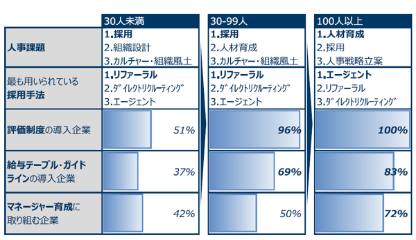 本サーベイ(回答企業数: 88社)結果より、従業員数30人未満の企業における主な人事のテーマは、リファーラルを中心とした採用であり、30人を超えると、評価・給与決定等のための仕組みを設ける企業が増え、100人を超えると人材育成がテーマとなることが明らかとなった。企業フェーズにより、直面する人事課題や取り組むべき施策が刻々と変化していくことがうかがえる。