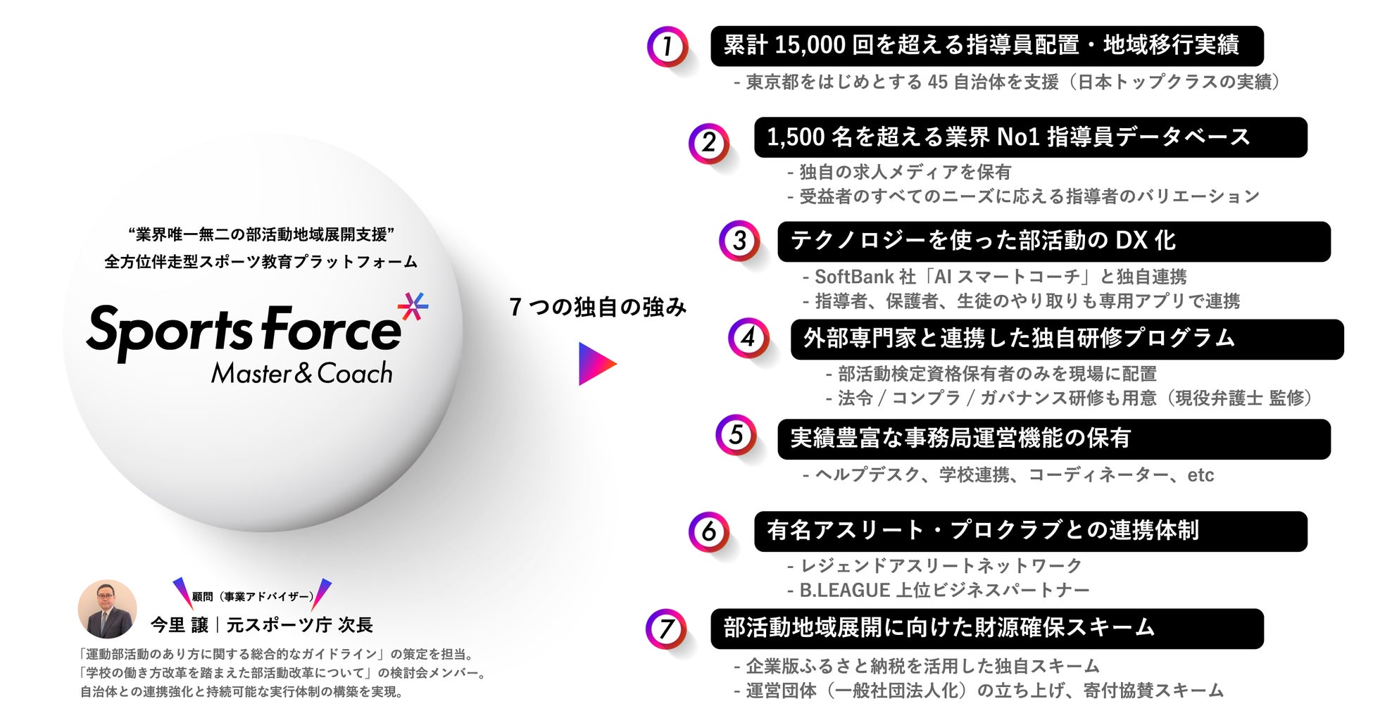 当社が運営する「SportsForce Master&Coach」は、約2,000名の質の高い指導員ネットワークと、複数の自治体での地域展開支援実績を活かし、教員の負担軽減と生徒への専門的な指導機会の提供という、部活動地域移行における重要課題の解決に取り組んでいます。