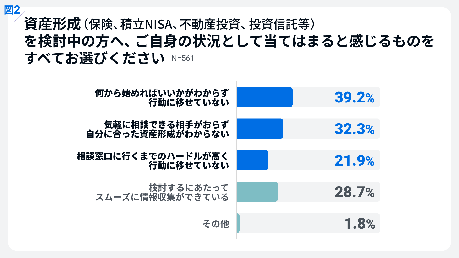 2023年8月に400Fが実施した「資産形成(保険、積立NISA、不動産投資、投資信託等)への興味関心に関するアンケート」(※2)によると、約半数が資産形成への興味関心があるという回答結果となりました(図1)。2024年は新NISA制度もスタート予定となっており、今後より一層「貯蓄から投資へ」の流れは加速し、資産形成への関心は高まっていくことが予想されます。一方で、多くの方は「何から始めればいいかがわからない」や「相談相手がいない」などが原因で、資産形成に関心があっても、行動に移せていないようです。(図2)