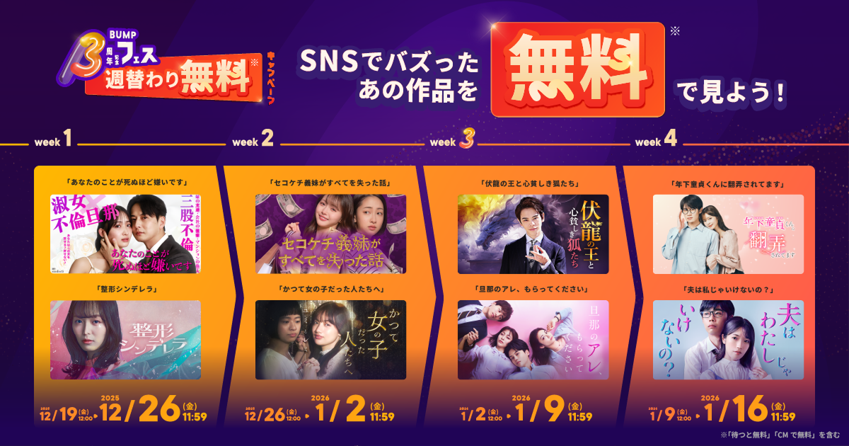 今回、さらに多くの方にショートドラマの魅力を知っていただけたらと思い「BUMP3周年記念フェス!週替わり無料キャンペーン」を開催いたします。ぜひお楽しみください!