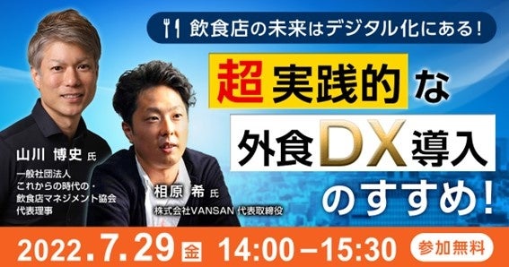 しかしいま、不安定な世界情勢と円安を受けた原価高騰や人材不足といった様々な問題に直面しつつも、感染拡大も緩やかに収束に向かい消費マインドが戻りつつあります。歓送迎会などの団体需要が戻り、入国制限の緩和によるインバウンドが戻る時期もそう遠くはないかもしれません。来る高まる需要をいち早くキャッチする飲食店はどのような飲食店なのか?多くの外食企業が取り入れているセルフオーダーやセルフレジだけではなく、採用や教育もデジタル化をすることによって成功している企業があります。今回は「飲食店の未来は外食DXにある」を実践する、幹部も現場も負担の少ないDXマネジメントの提案や、経営者やコンサルタントのネクストキャリアのサポートを行なっている、「一般社団法人これからの時代の・飲食店マネジメント協会」山川代表と、レインズインターナショナルに入社後、最年少で事業本部長に抜擢されたのち、2014年に株式会社BRAVASを創業し、DXを活用した店舗展開でイタリアンレストラン「VANSAN」を数年で60店舗以上に拡大した「株式会社VANSAN」相原社長をお招きし、なぜ外食DXが必要なのか、外食DXの最初の一歩は何をすべきか、外食DXの未来などを語っていただきます。外食DXをリアルに活用してきたからこそお伝えできる内容をお届けします。一つでも学びを持ち帰ってもらえれば幸いです。是非ご参加ください!